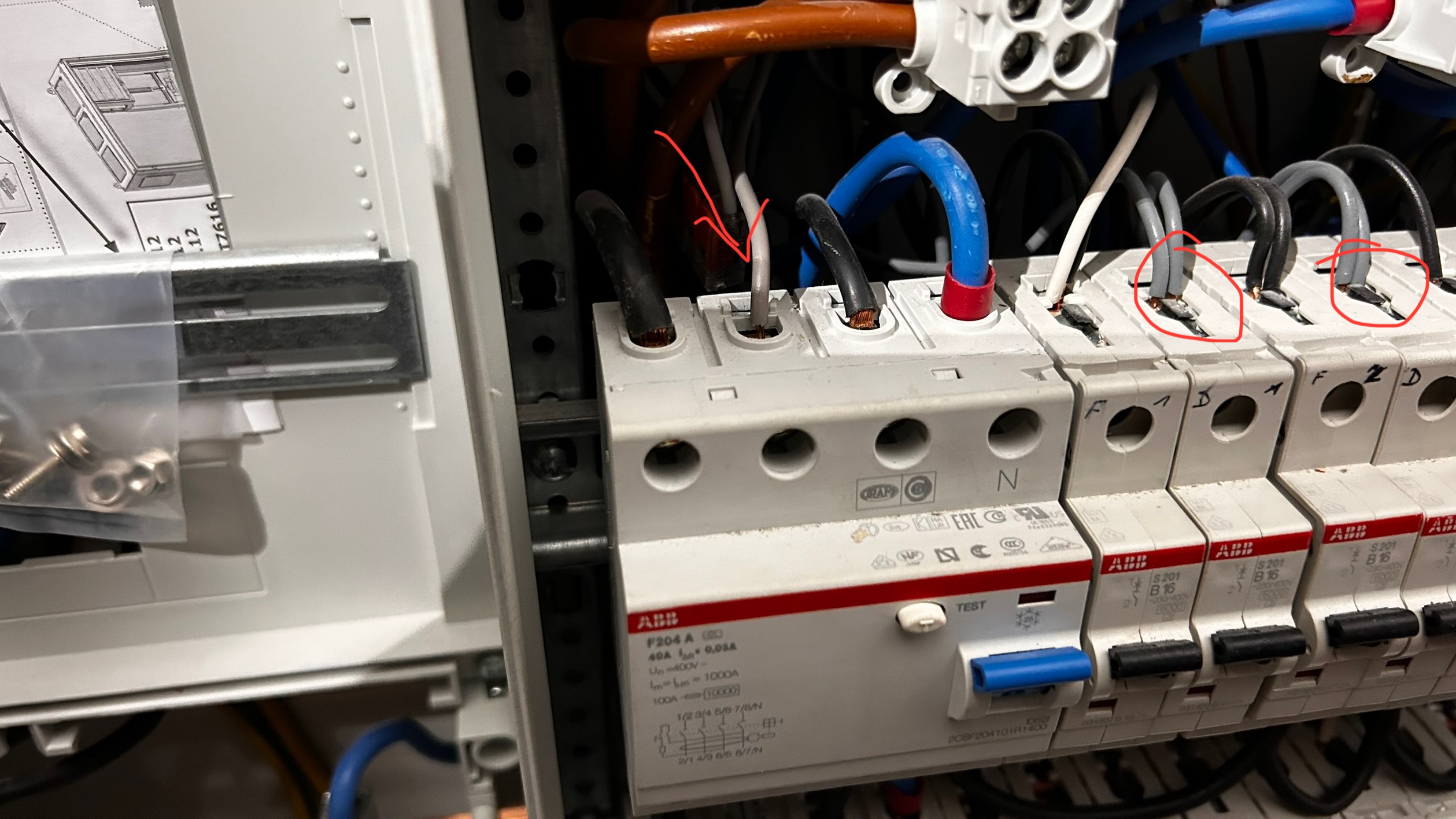 In ein ABB F204A gehen 10qmm (230V), 2,5qmm (12V) und eine 6qmm (230V) Leitung rein; die 2,5qmm Leitung ist anscheinend für LCN. Ebenso sind Sicherungsautomaten an diesem FI, die laut LCN-Elektriker (aus 2015) nur für die Datenleitungen sind, um die Module – falls sie mal hängen sollten, ein/aus schalten zu können.