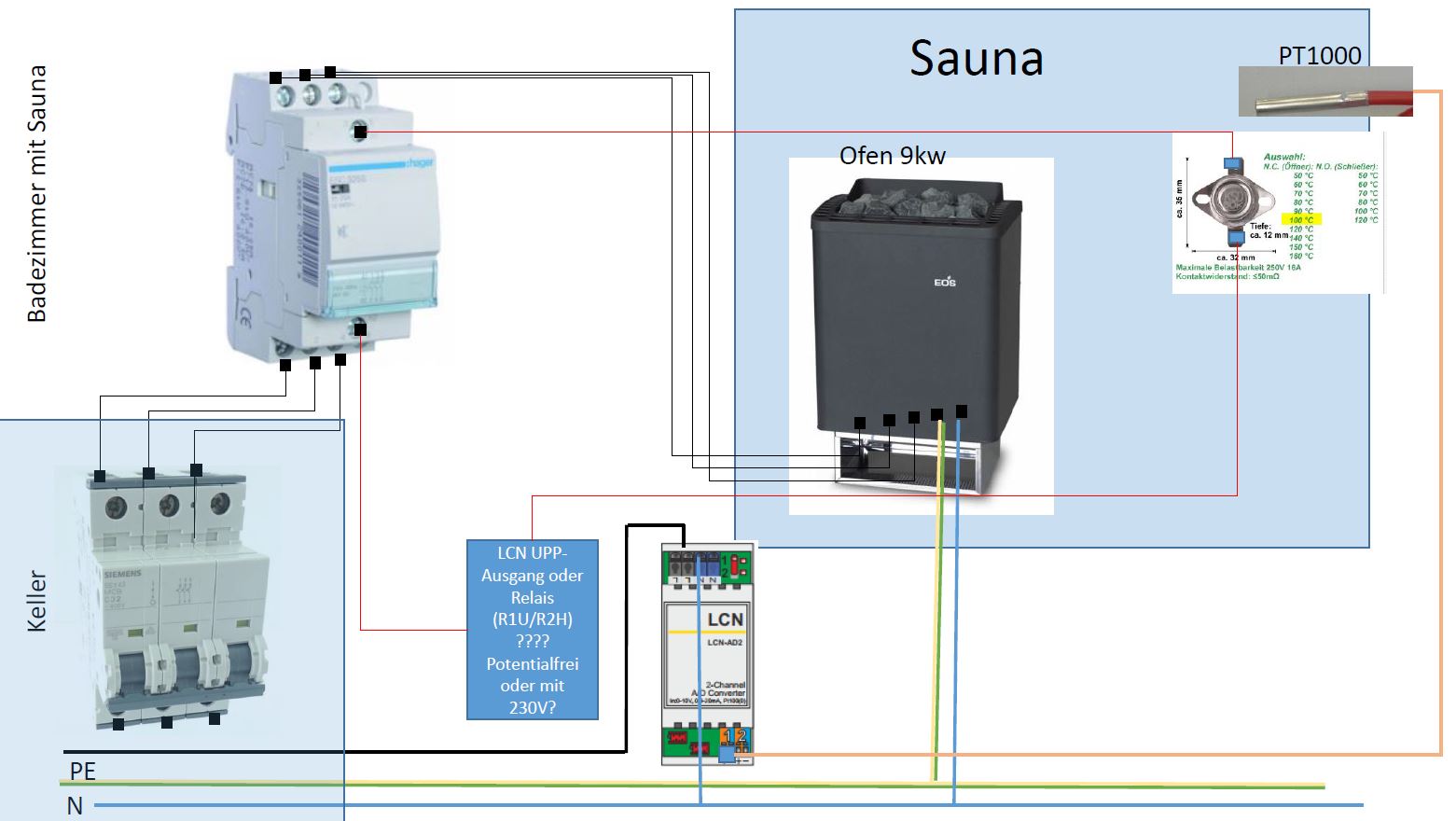 Der Ofen wird über ein Leistungsschütz geschaltet. Die Temperatur der Sauna wird über ein PT 1000 gemessen. Der Schütz soll nun über LCN aktiviert werden. Einen Thermoschalter will ich ebenfalls integrieren, damit ab 110 Grad der Strom zum Ofen getrennt wird. Thermischalter habe ich bisher nur 10A gesehen.Wie sollte ich das am besten mit LCN umsetzen?