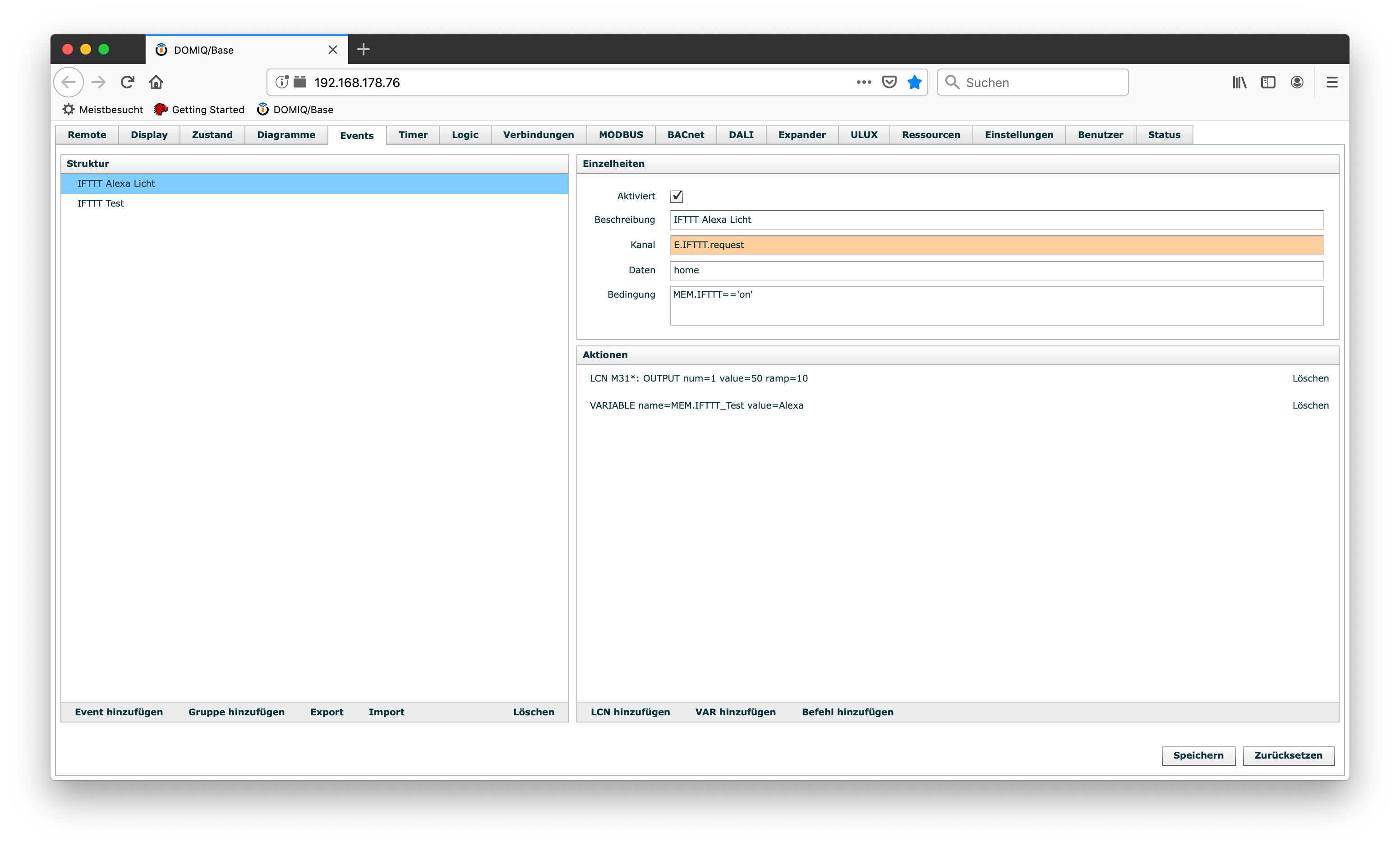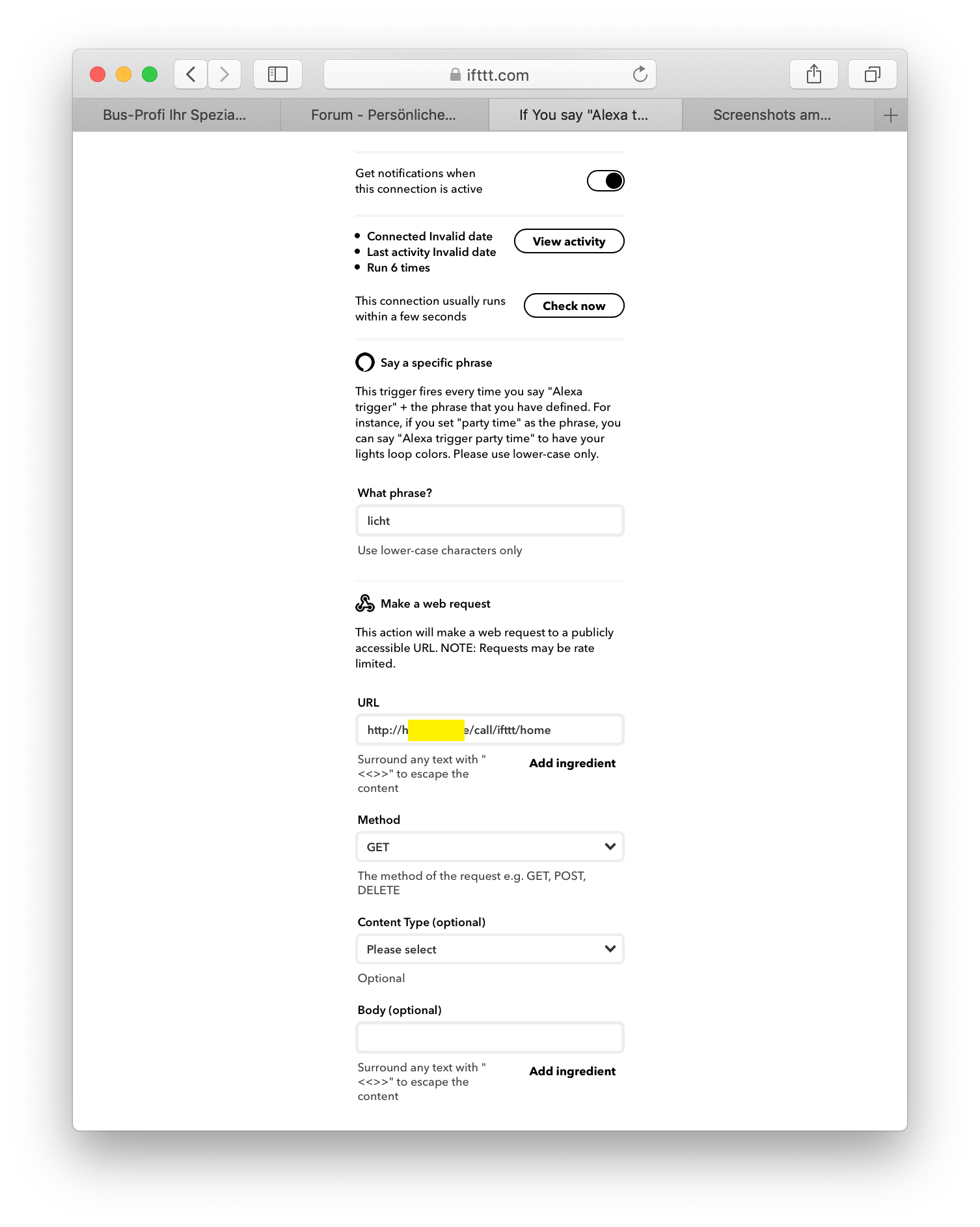 aktuell versuche ich meine DOMIQ Base mit Alexa zu verbinden um mein LCN über Sprachbefehle zu steuern. Hierfür habe ich die DOMIQ entsprechend konfiguriert. Über die URL "http://<meine-IP>/call/ifttt/home" kann ich das Kommando (Licht einschalten) über einen Browser ausführen. Dieses bedeutet in der Base ist alles korrekt konfiguriert (IFTTT ein / Event) und auch die Konfiguration vom Router (Port Freischaltung) passt. Wenn ich nun in der IFTTT ein entsprechendes Applet aus "Amazon Alexa" und "Webhooks" konfiguriere führt dieses nicht zum gewünschten Ergebnis. Mit dem Kommando - "If You say "Alexa trigger licht", then Make a web request" wird die selbe URL aufgerufen wie aus dem Browser. Nur der Aufruf aus Webhooks heraus funktioniert nicht (URL: http://<meine-IP>/call/ifttt/home - Methode: GET - Optionaler Teil nicht gefüllt).