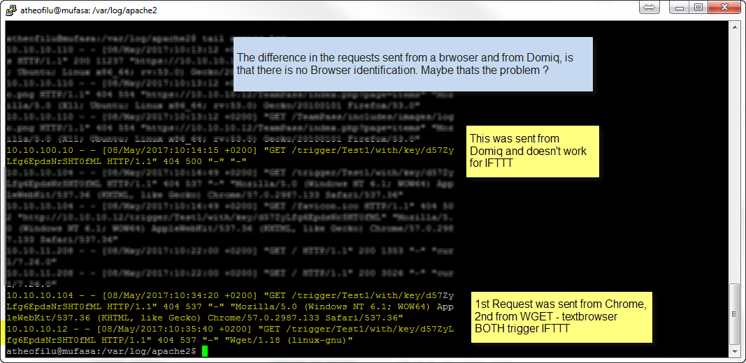 So wie es aussieht schickt Domiq beim Get keine Browser Info mit und dies scheint IFTTT nicht zu mögen... siehe
