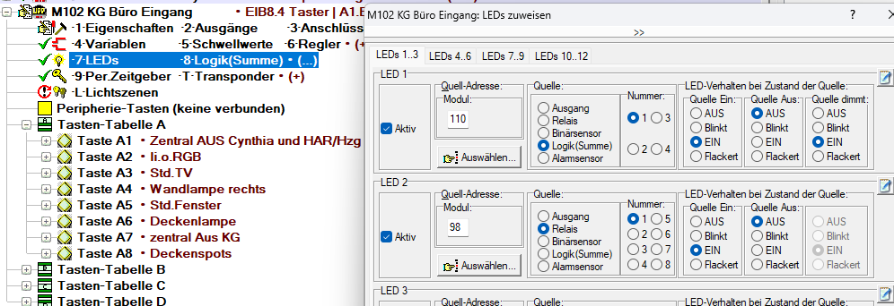 Tastenkopieren hat funktioniert, was ich aber nicht beachtet hatte ist, dass auch eine Summe für die LEDs dahinterliegt. Das heißt die rote Diode auf der Zentral Taste für Büro und Heizungsraum hat rot geleuchtet wenn einer der Räume an ist und bei Zentral AUS drücken gingen dann die Lichter aus und auch die rote Diode.